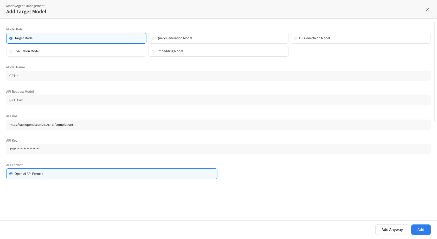 특히, 평가에 활용하는 타겟모델은 응답을 생성할 수 있는 모든 API기반 서비스(Agent 포함)를 모델로 인식합니다.