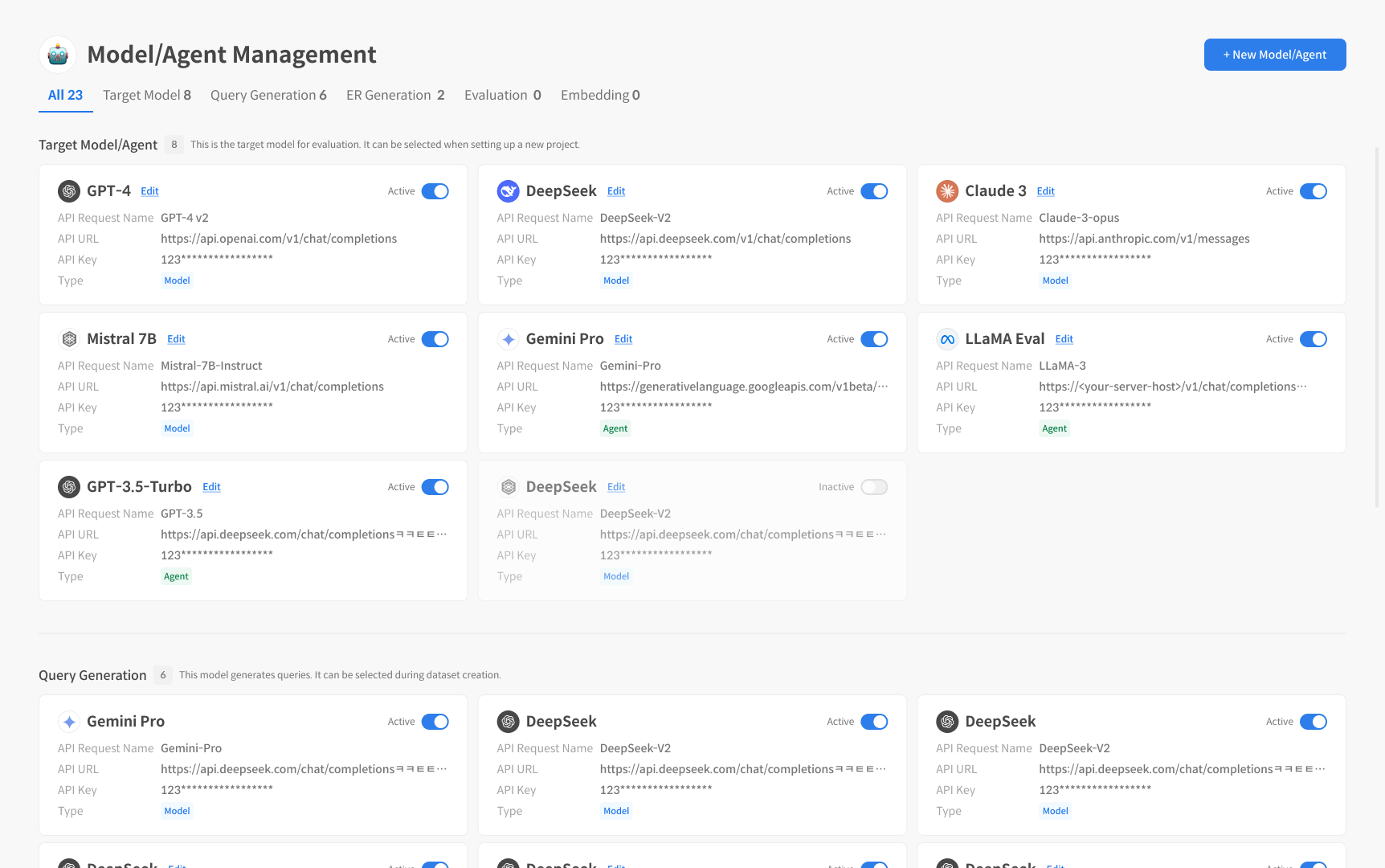 - 활성화/비활성화 토글을 통해 프로젝트에서 표기 여부를 제어할 수 있습니다. → 비활성화된모델/에이전트는 평가 시 선택 목록에 표시되지 않습니다.