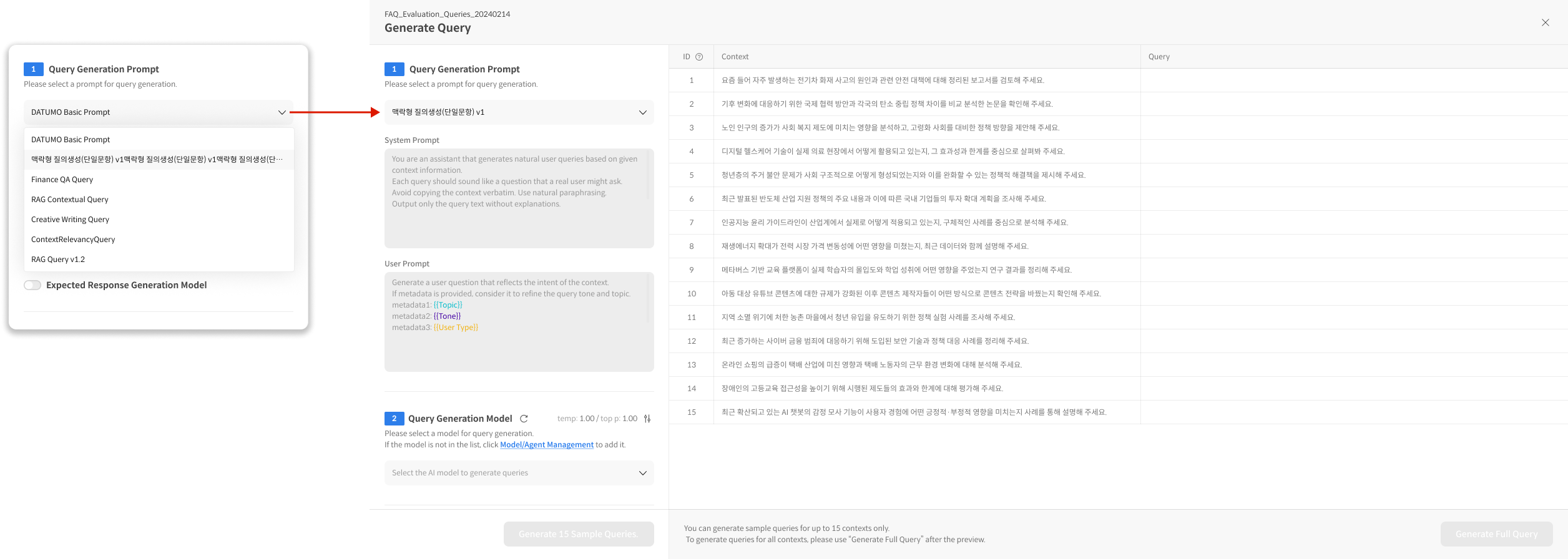 활성 상태의 Prompt만 드롭다운 리스트에 표시됩니다. 기본 제공되는 Datumo Basic Prompt 이외 추가하고 싶다면 Query Generation Prompt 관리를 참고하여 프롬프트를 먼저 생성해야 합니다.