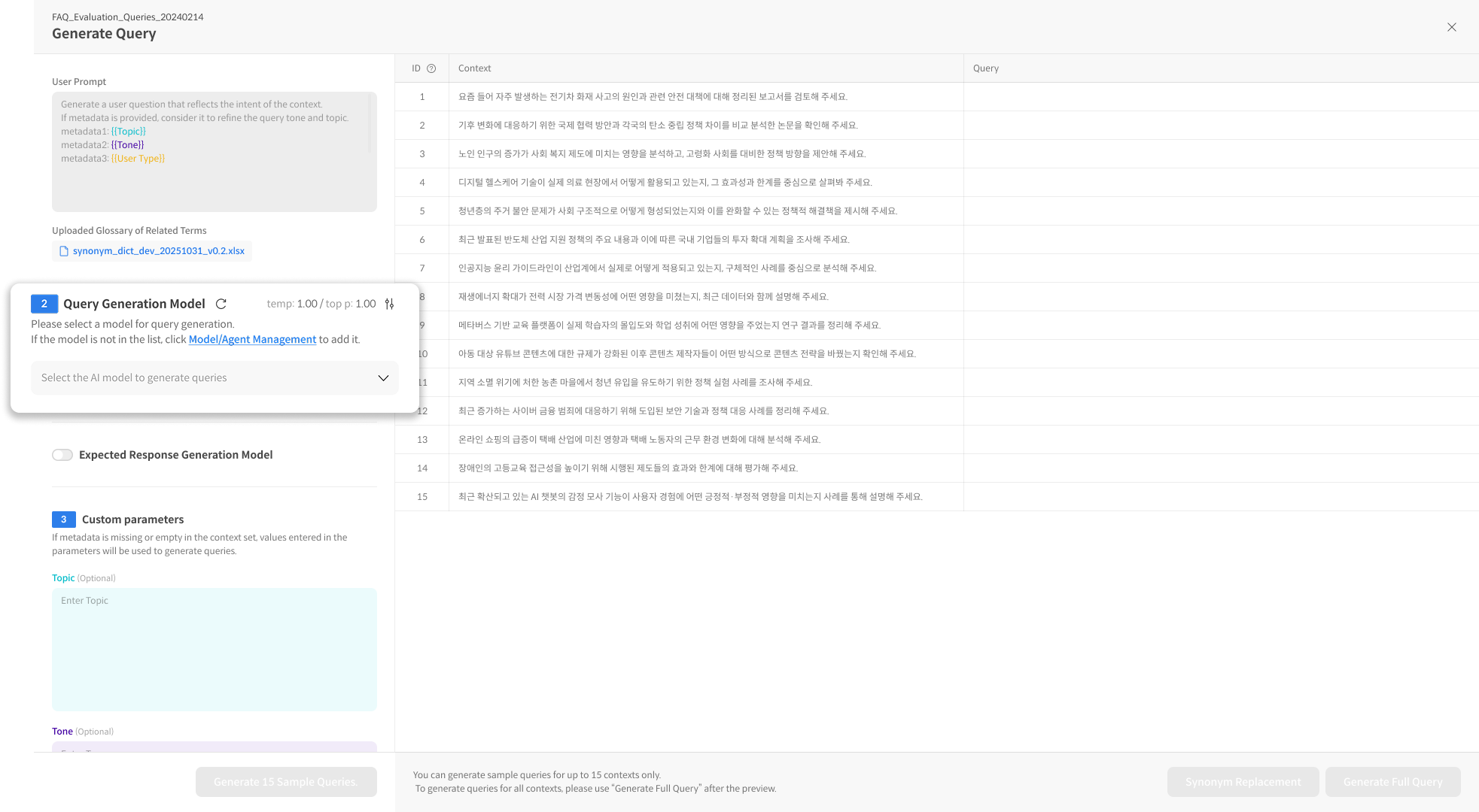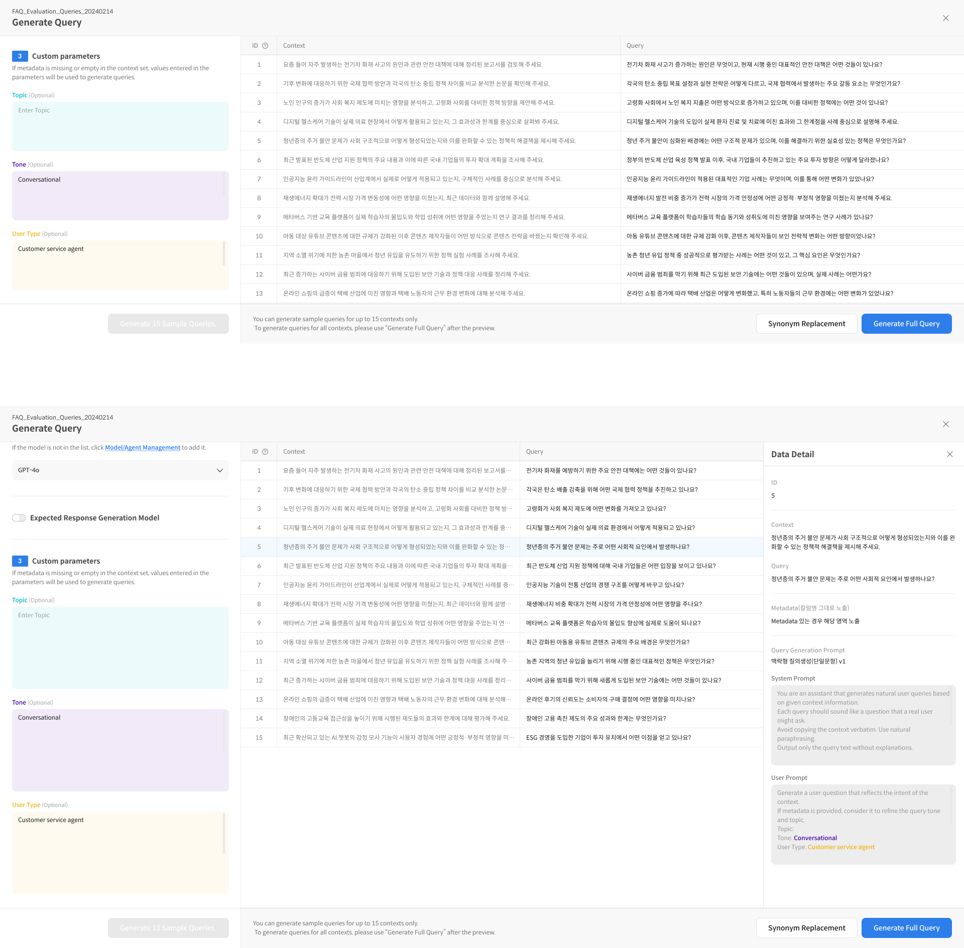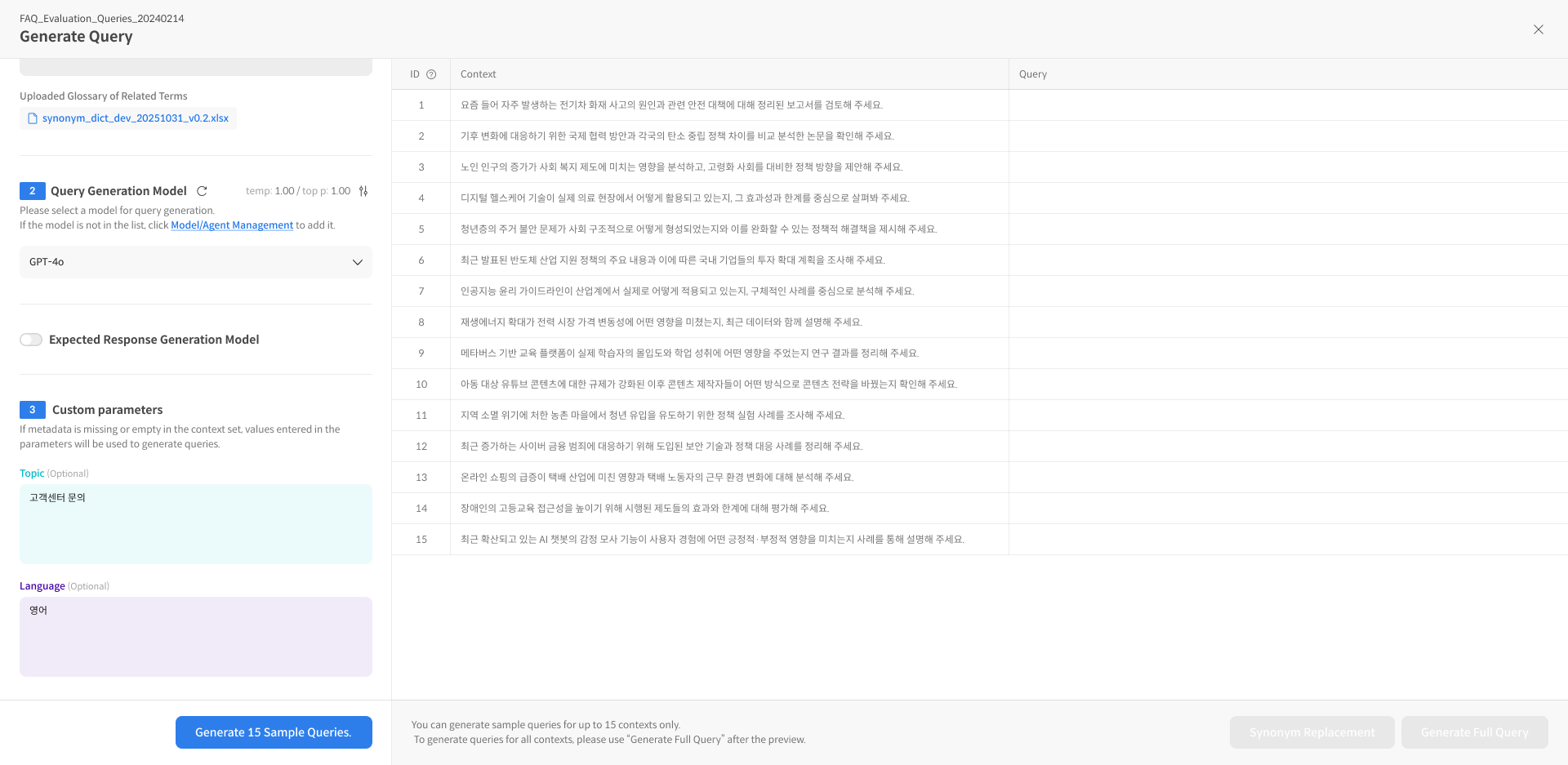 [Generate 15 Sample Queries] 버튼을 클릭하여 샘플을 먼저 확인합니다. 생성된 Query를 클릭하면 상세 내용을 확인할 수 있습니다.