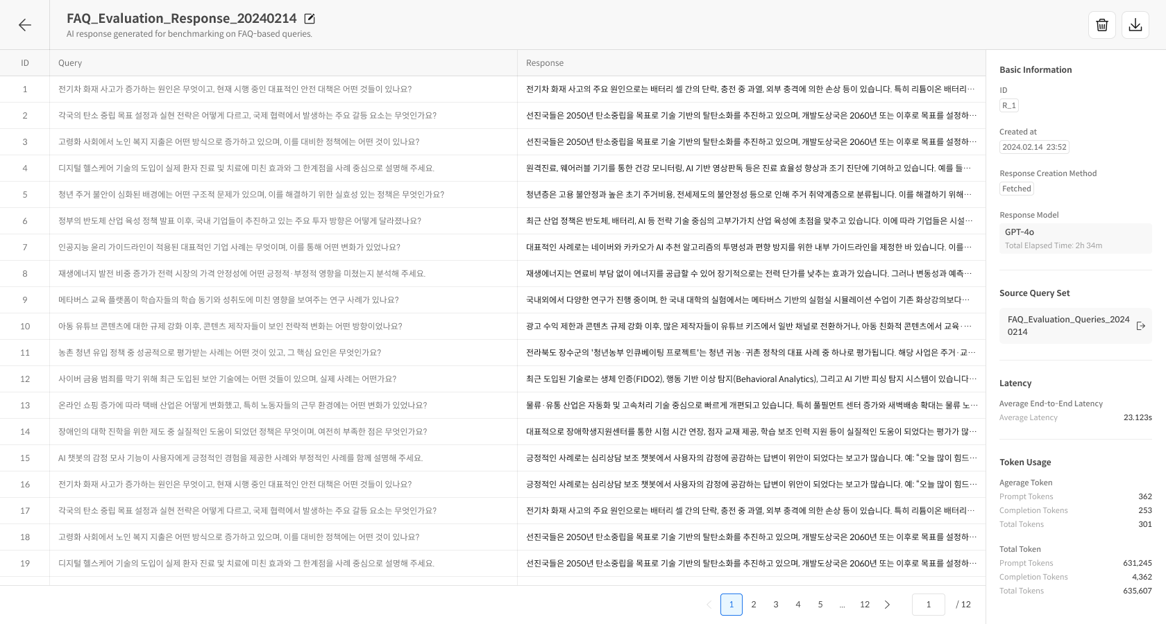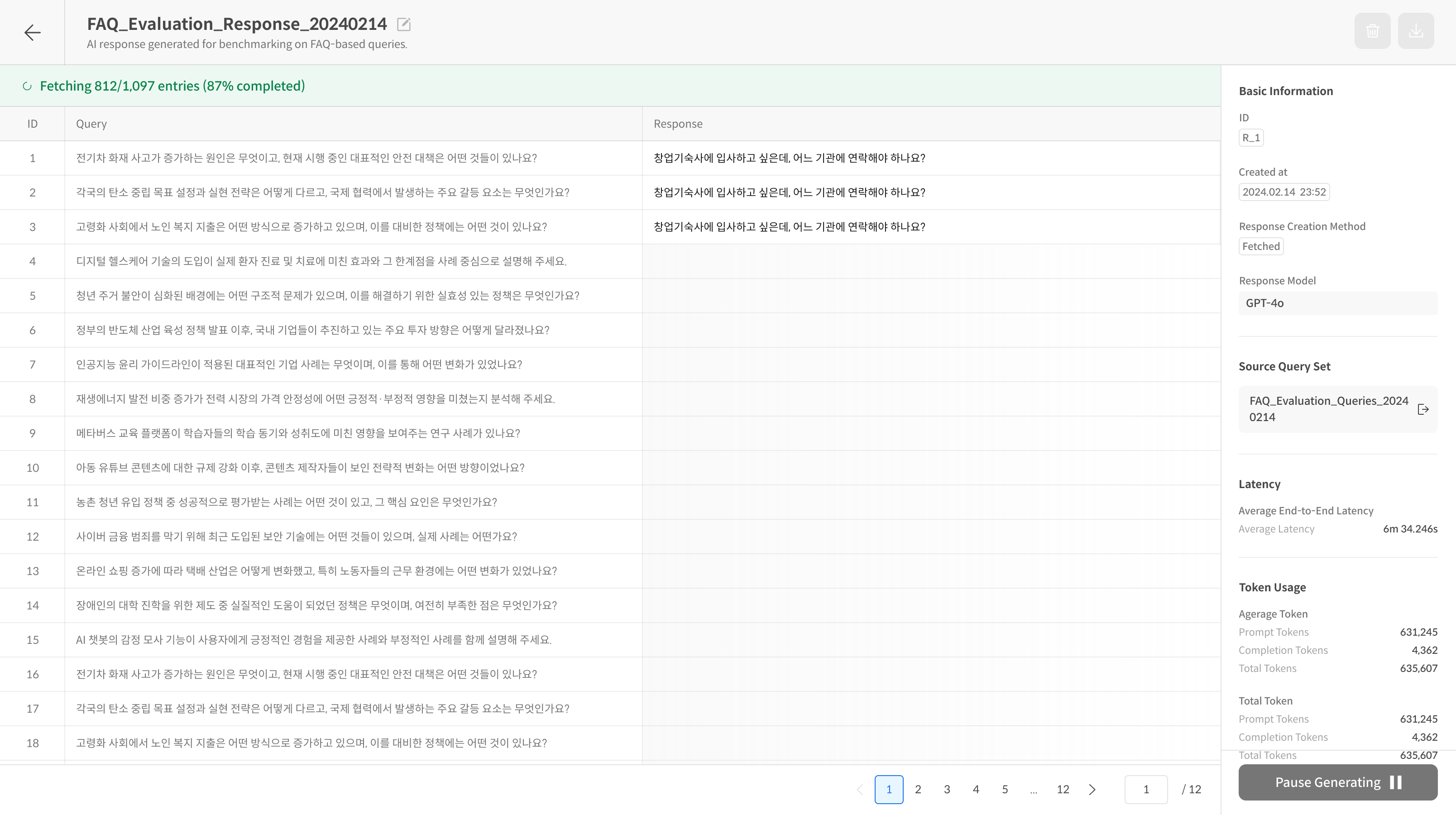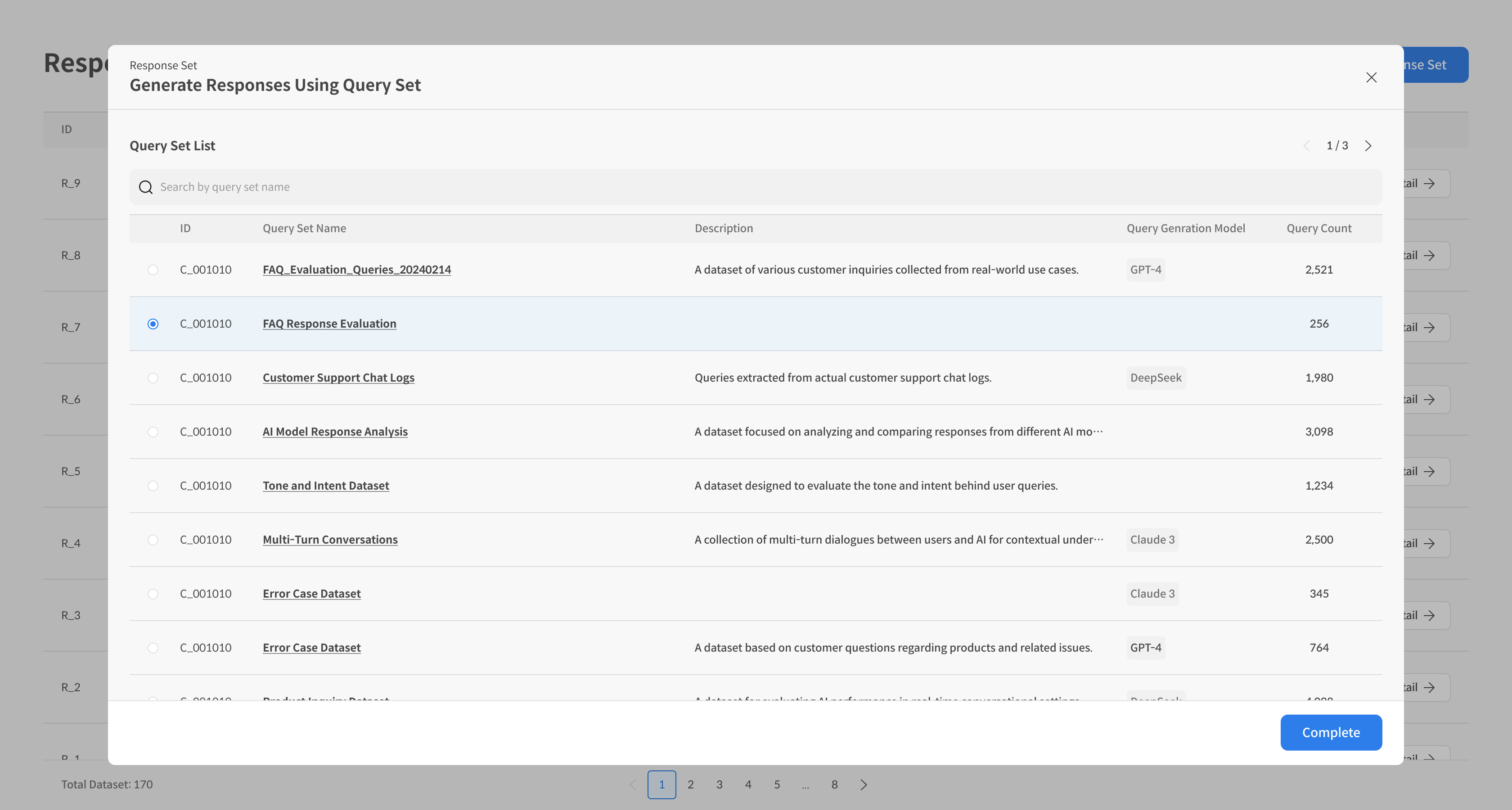 - Query Set을 선택하여 AI 모델이 자동으로 Response 생성