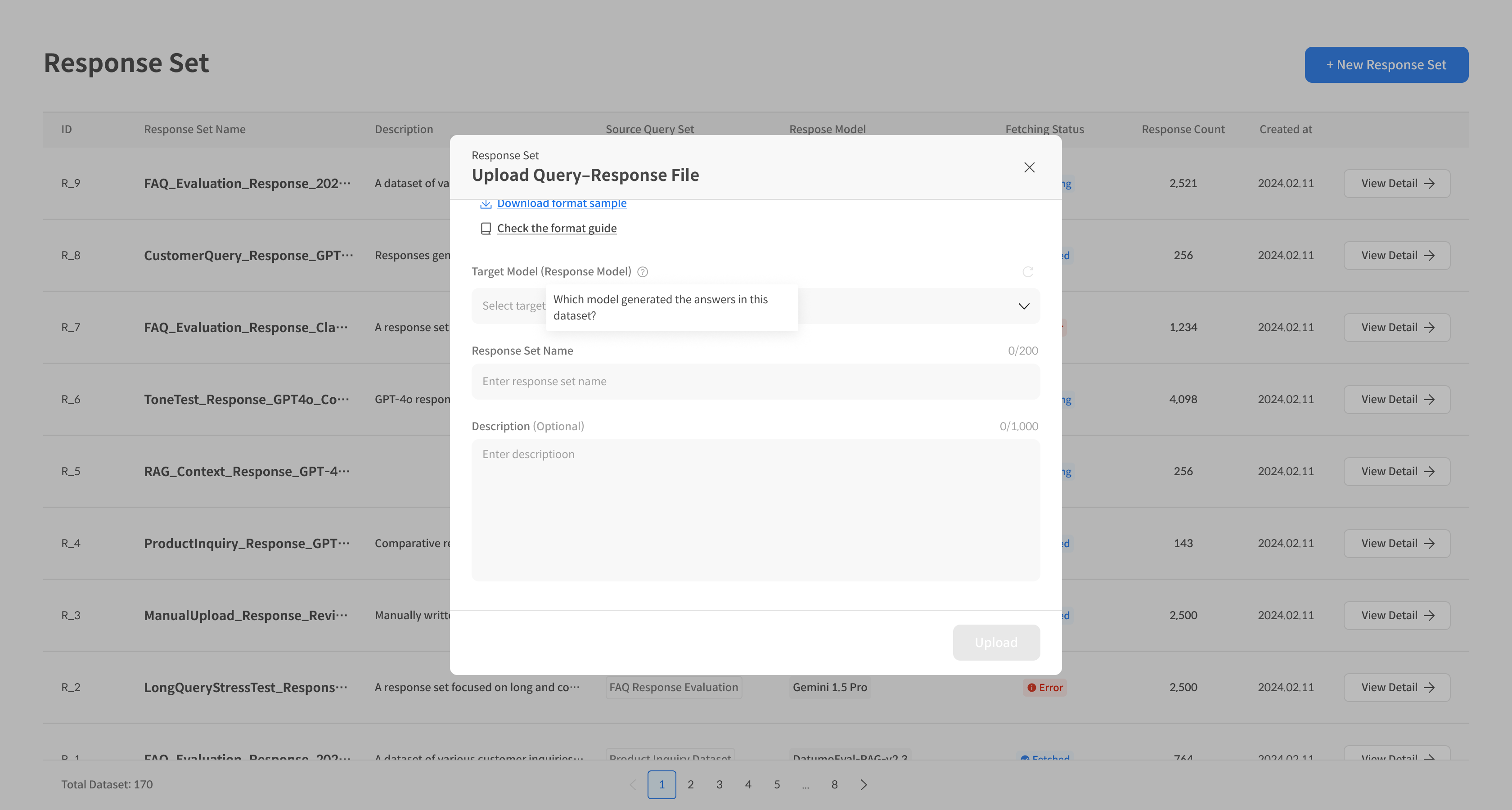 Response Set 생성 시 입력하는 Target Model은 단순히 응답을 만든 모델명을 기록하는 것에 그치지 않습니다.