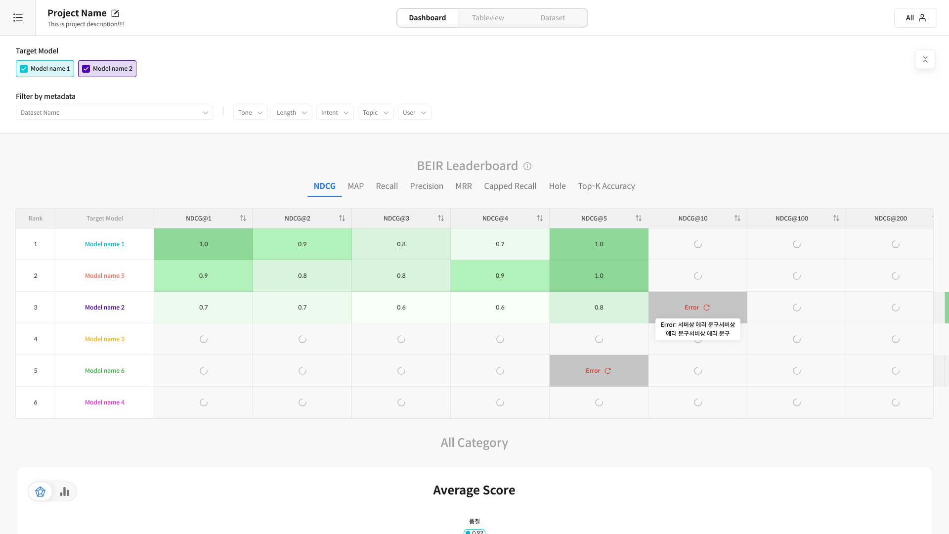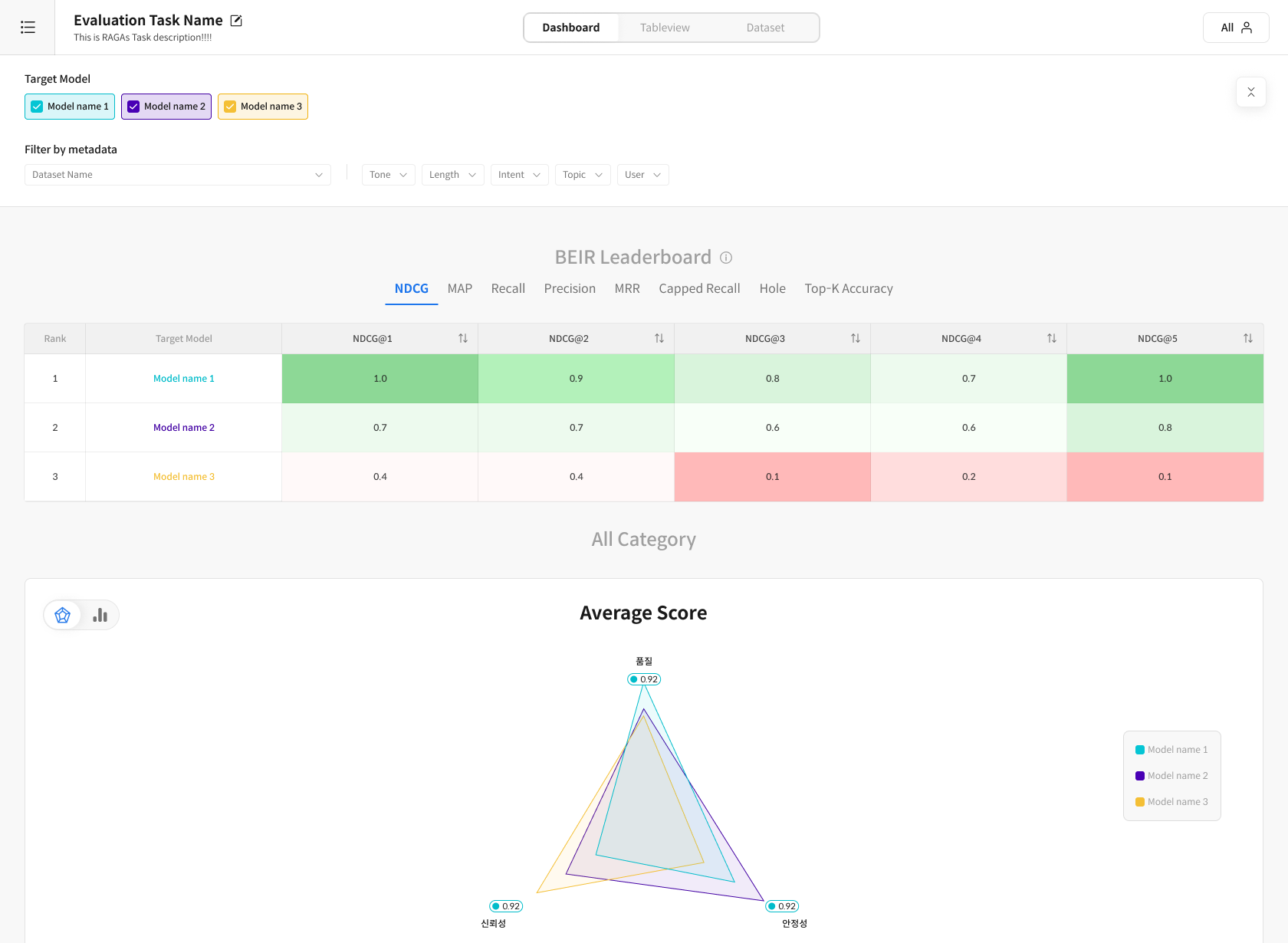평가 완료 후에는 Dashboard 상단의 BEIR Leaderboard에서 결과를 확인할 수 있습니다.