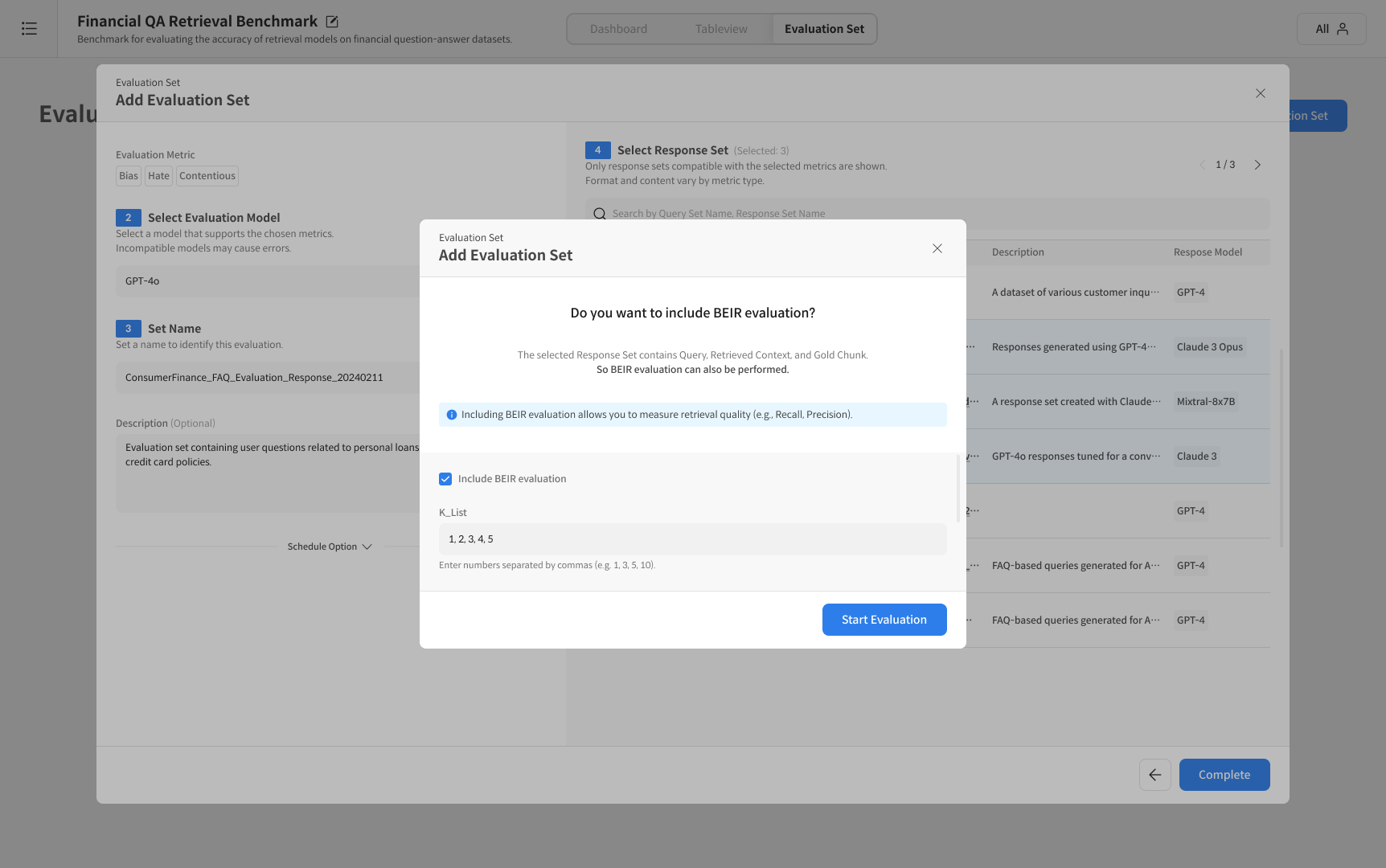 BEIR 평가 포함 여부를 선택하는 모달 화면