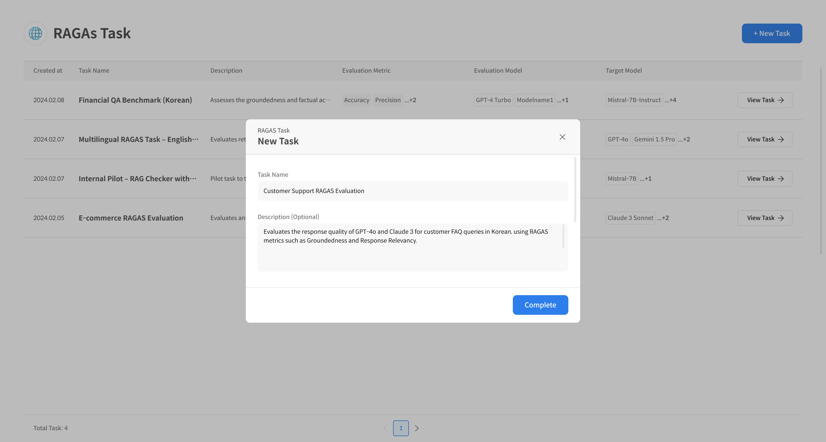 TutorialsJudgment Evaluation🌐 RAGAs Task1. Create a RAGAs Task이 페이지에서 Step 1. Task 생성 ① RAGAs Task 생성 진입 [RAGAs Task] 페이지 우측 상단의 [+ New Task] 버튼을 클릭하여 새로운 평가 작업을 시작합니다. ② Task 정보 입력 Evaluation Task의 이름과 설명 입력 User별 접근 권한 설정 (기본값: All Users) ③ RAGAs Task 생성 완료 [Complete] 버튼 선택으로 Task 생성 완료 생성된 Task는 리스트 최상단에서 확인 가능