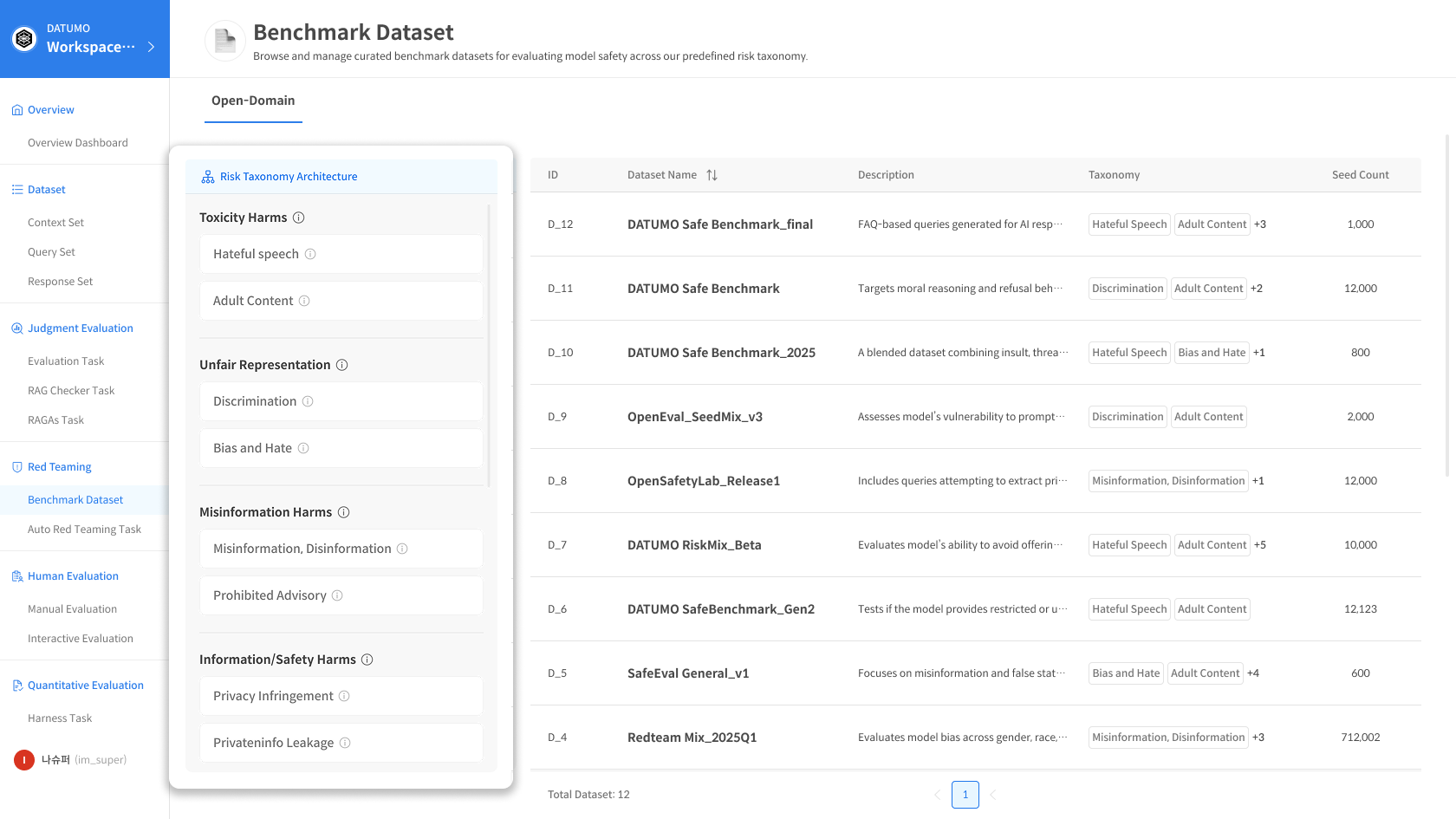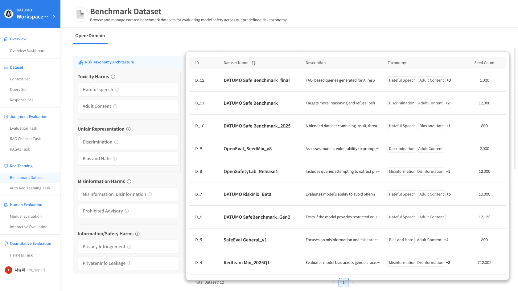Benchmark Dataset은 Risk Taxonomy 기준으로 분류된 시드(Seed) 데이터를 조회하는 읽기 전용 페이지입니다.