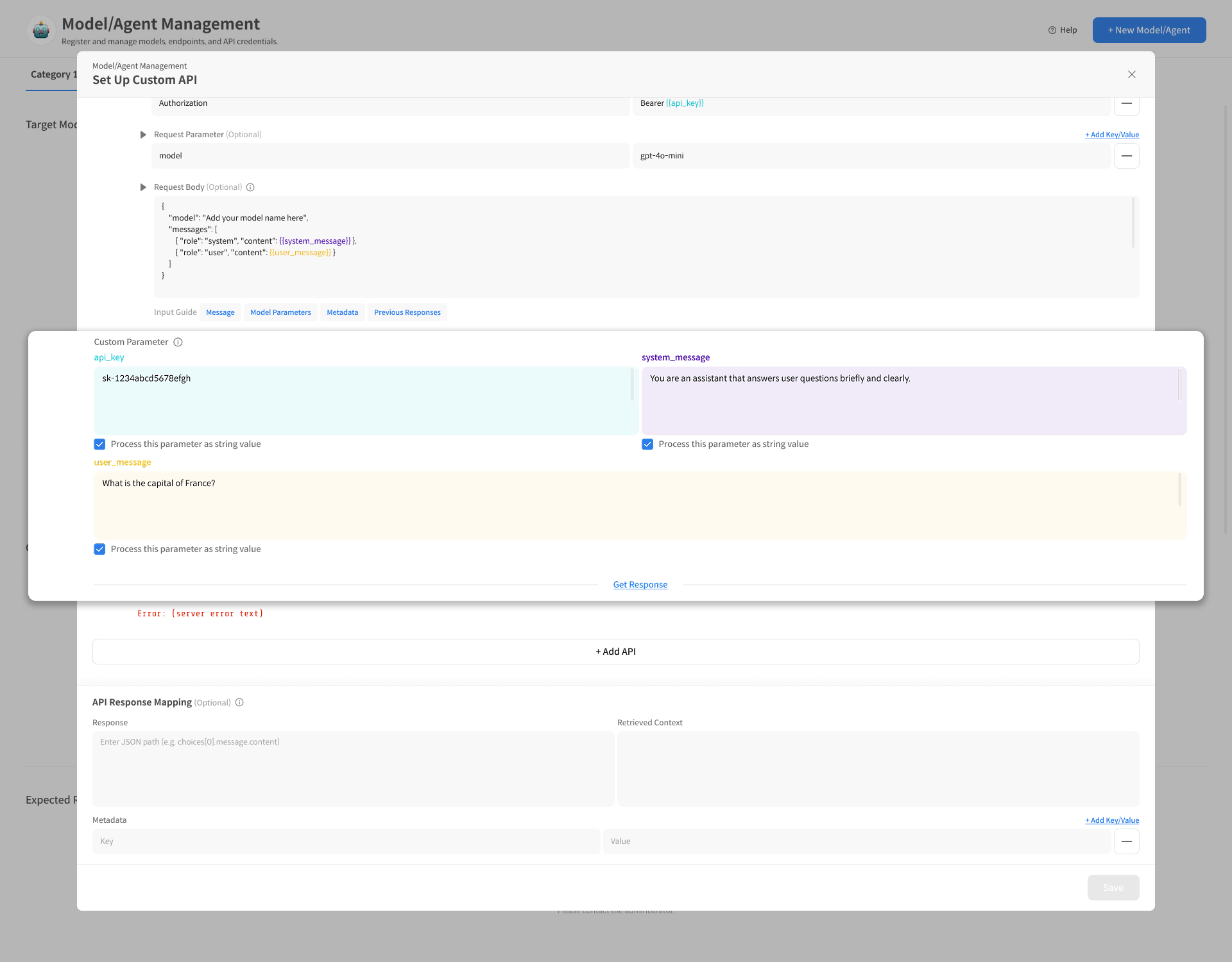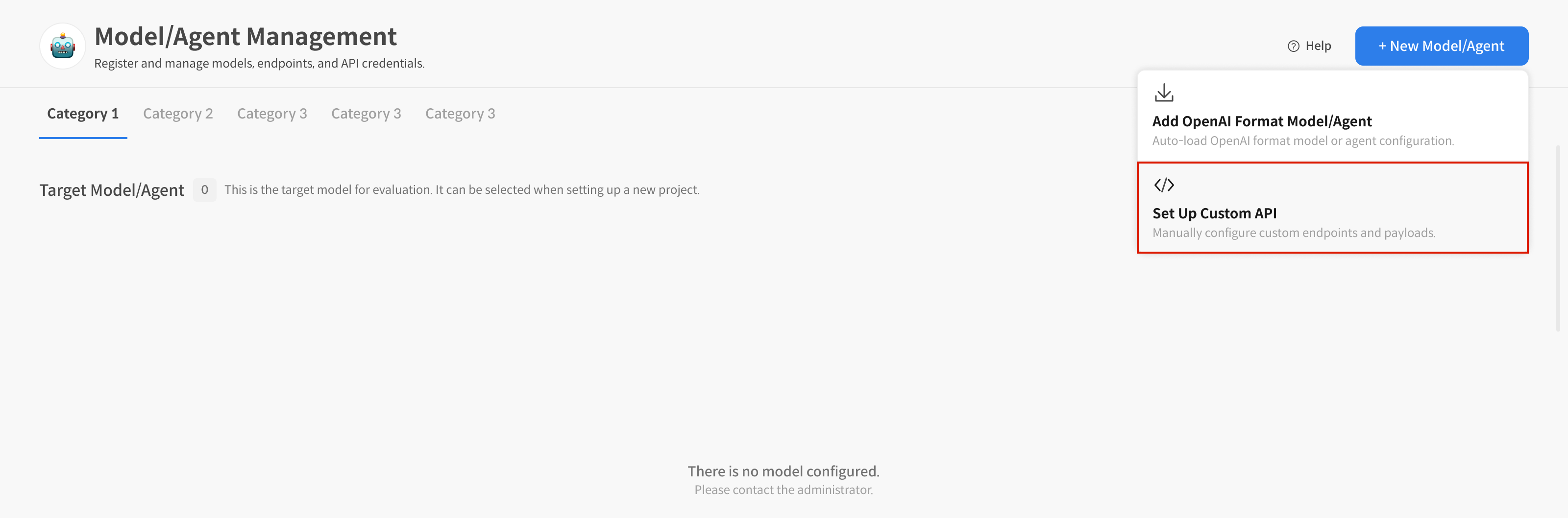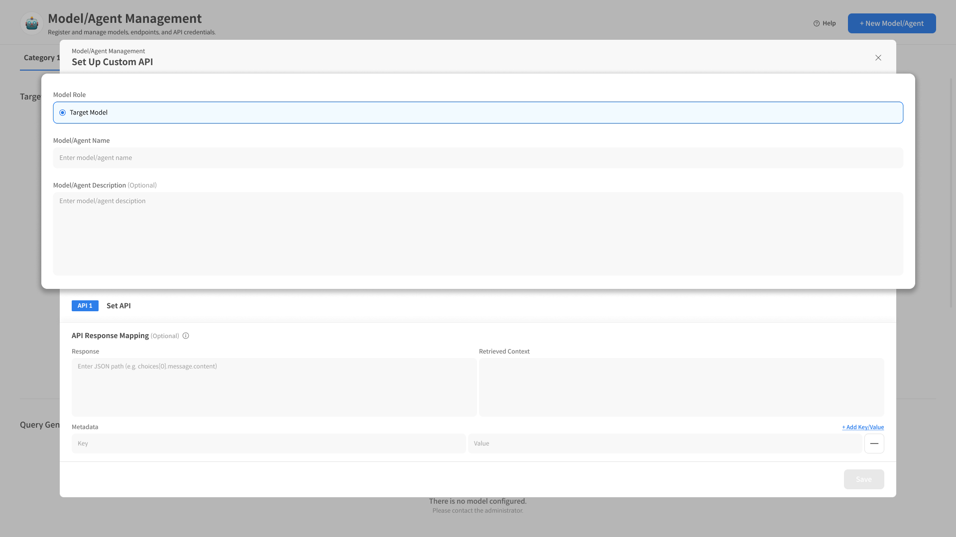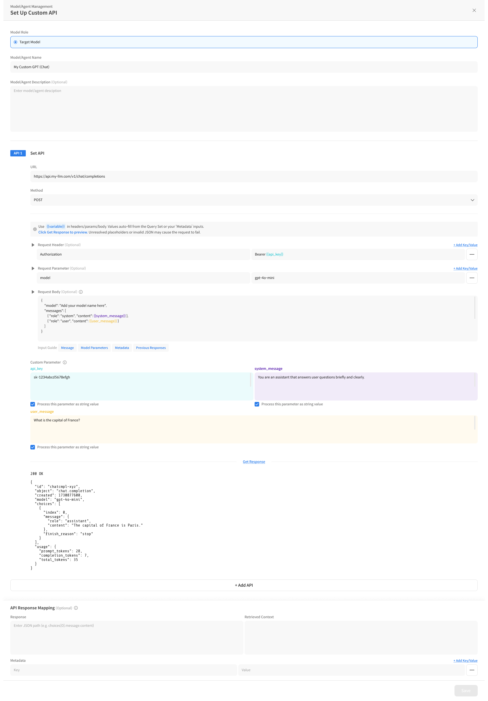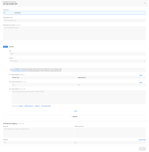Custom API는 Target Model/Agent 역할로만 등록할 수 있습니다.