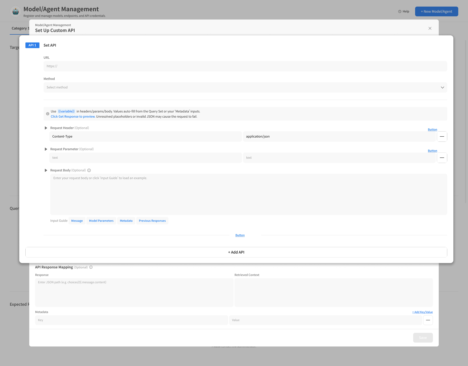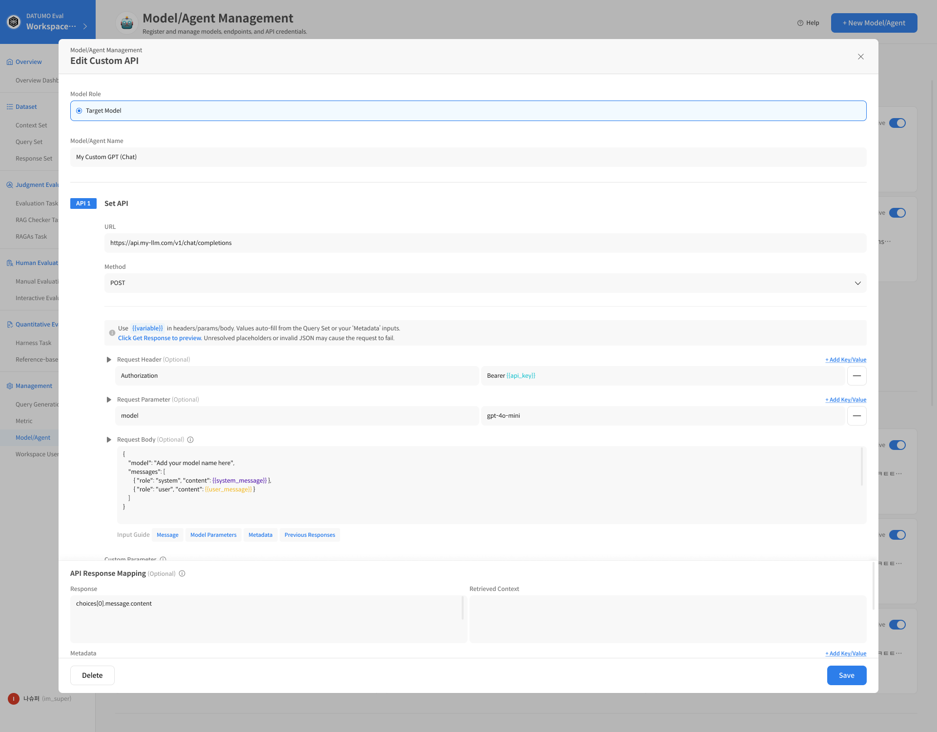 외부 API를 Target Model/Agent로 등록하여 Datumo Eval에서 모델 평가 및 응답 자동 수집을 수행할 수 있습니다.