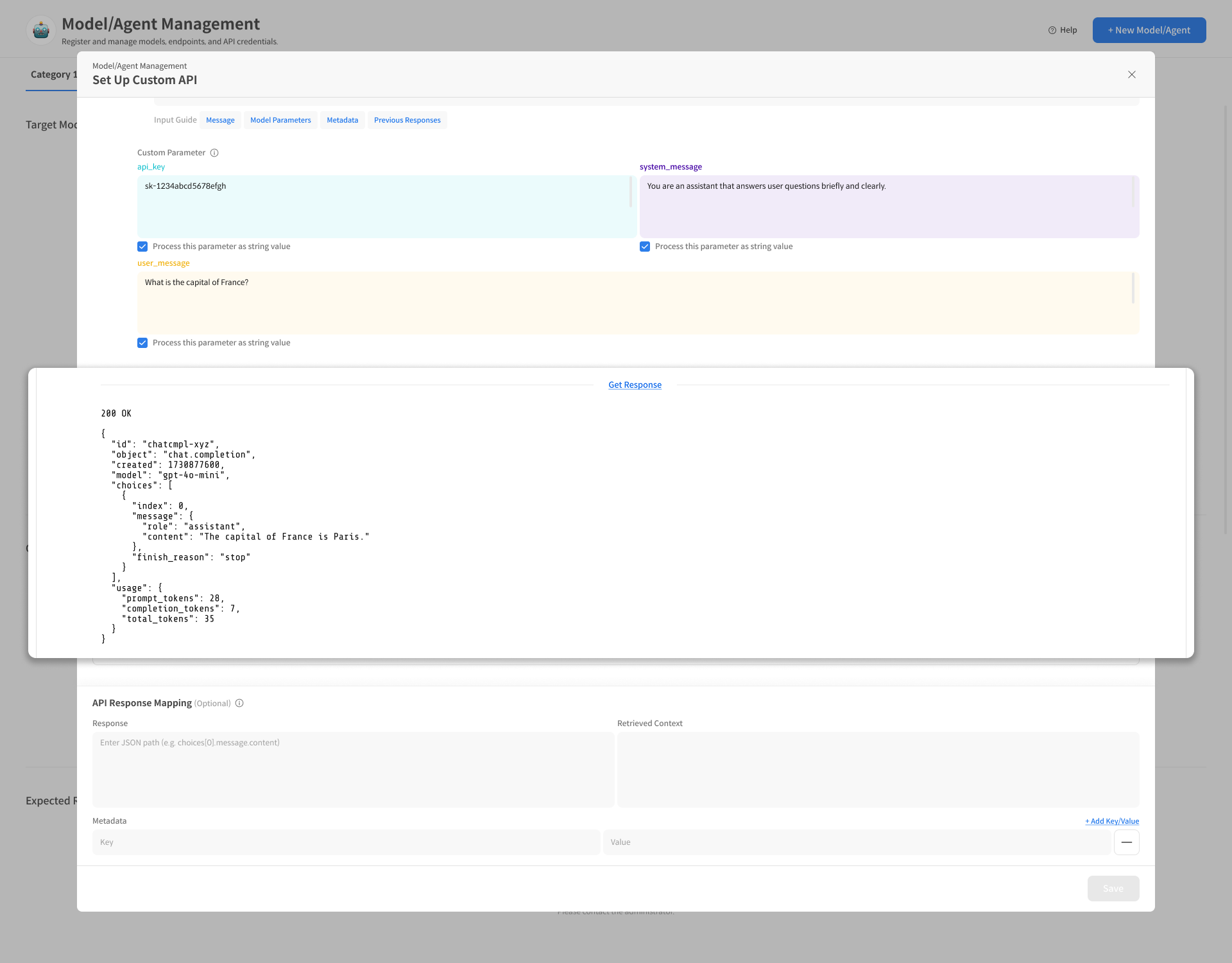 API Response Mapping은 Datumo Eval이 응답(JSON)에서 필요한 값을 찾을 수 있도록