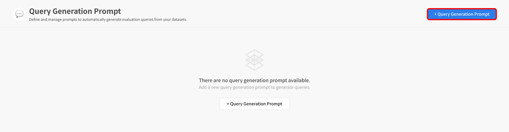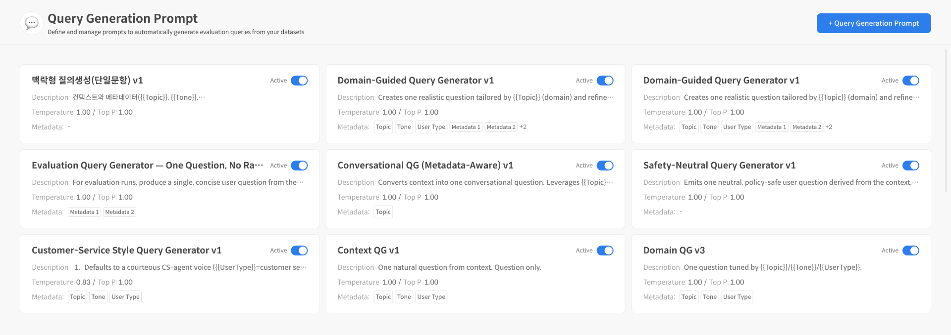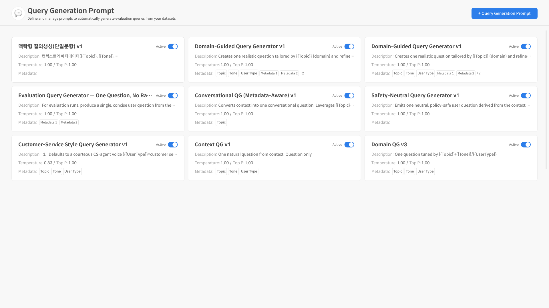 신규 프롬프트 생성을 위해 메인 화면 상단의 ‘+Query Generation Prompt’ 버튼을 선택합니다.