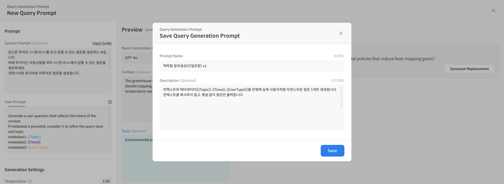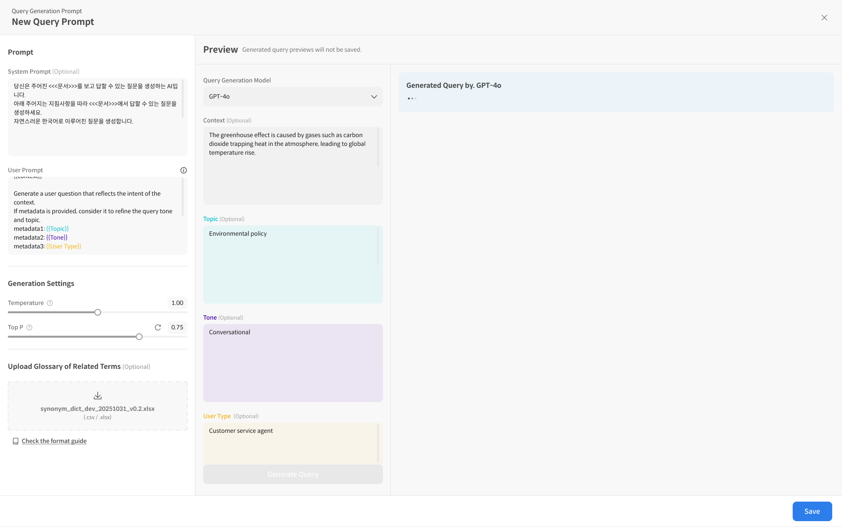 - User Prompt(필수): 질문 생성 규칙, 형식, Metadata 반영 방식 등 명시