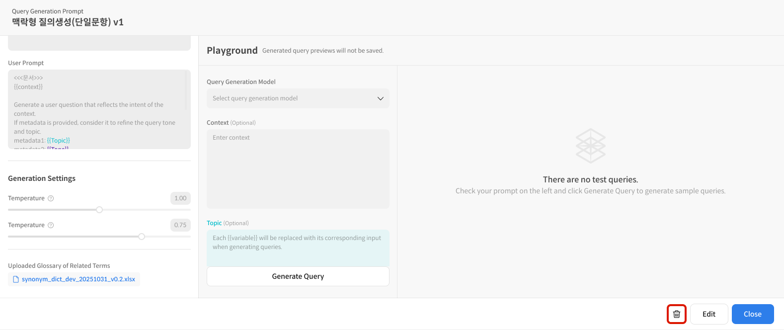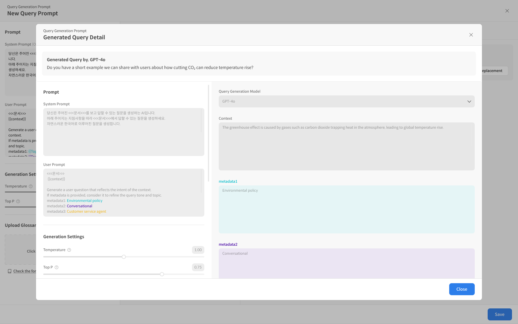 샘플 쿼리를 1개 생성하여 적용된 프롬프트와 Metadata 반영 여부를 확인할 수 있습니다.