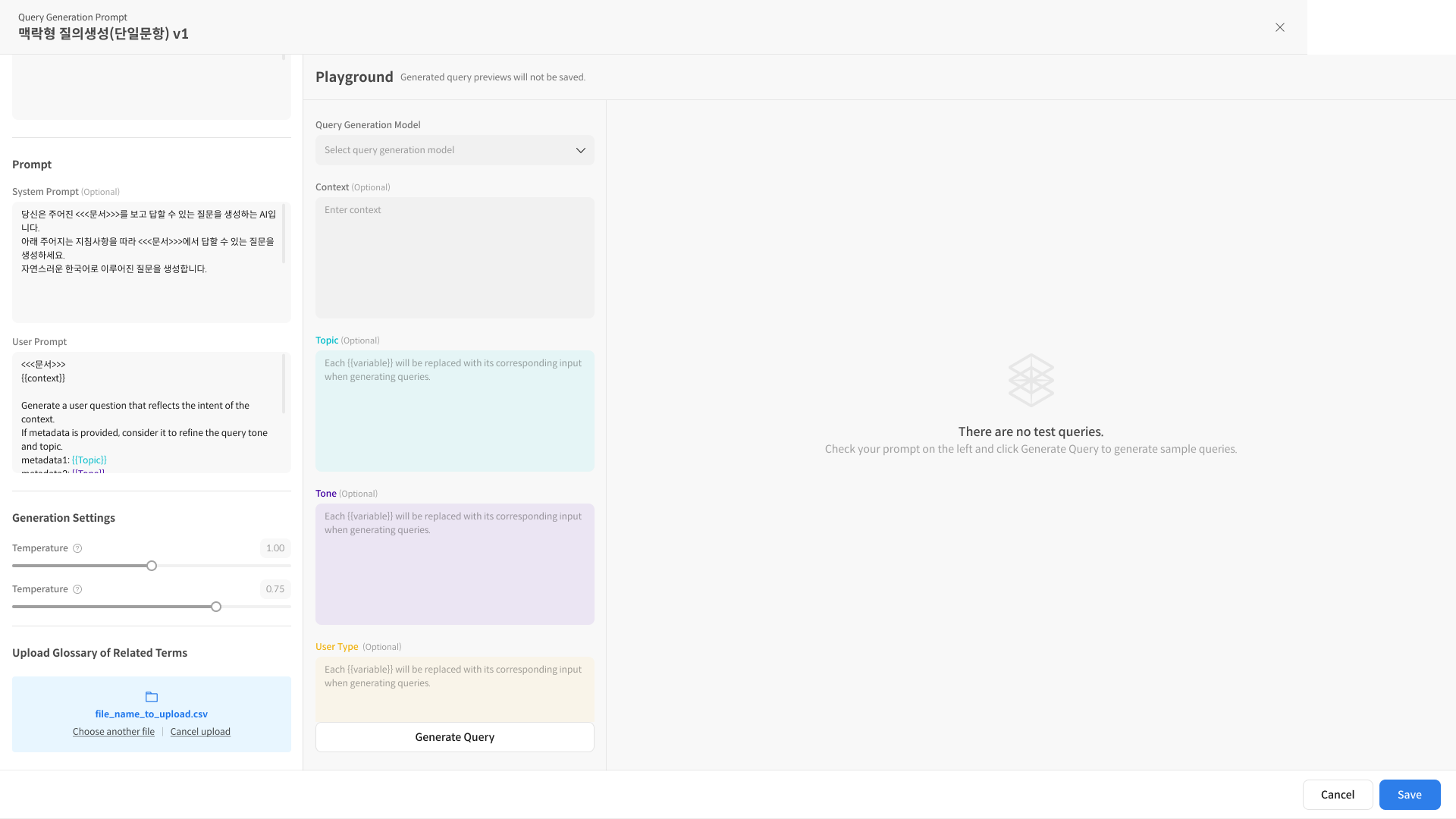 Query Generation Prompt 설정 화면은 Setting과 Playground 두 화면으로 구성되어 있습니다.