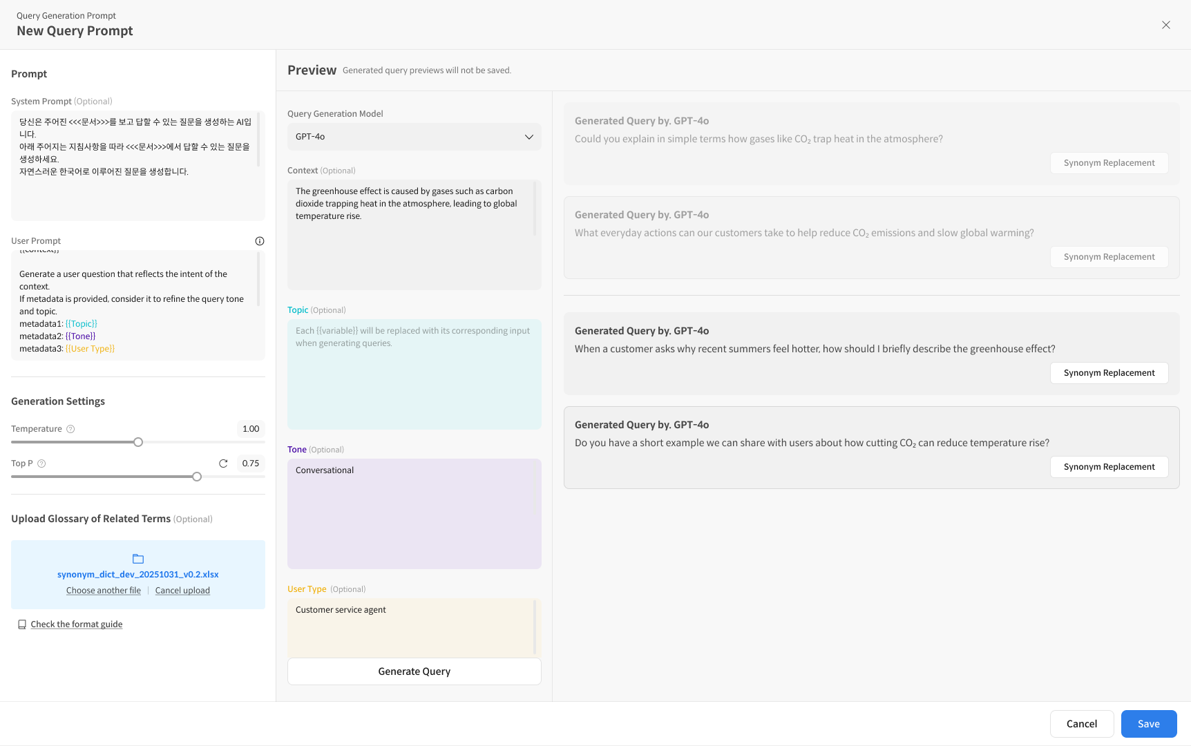 신규 프롬프트 생성 과정 중, Upload Glossary of related terms 영역에서 유의어 사전을 업로드할 수 있습니다.
